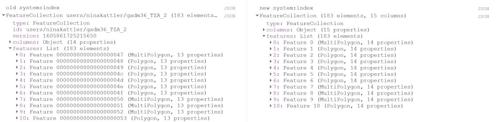 Why do this at all? I was struggling to produce a mean value of the COPERNICUS landcover data, after having created a successful script for the MODIS NDVI dataset. When I ran the script, no mean column was created. However, I was able to calculate mean values from a couple of polygons that I created myself within Google Earth Engine, so I knew the problem had to be in the shapefile somehow. So I started to investigate the gadm asset (i.e. the shapefile) and saw that Google Earth Engine automatically assigns some odd index names to each feature (e.g. 000000000001 or 0000000000a). I used the following steps described by the user Kuik on StackExchange to change the system:index:
