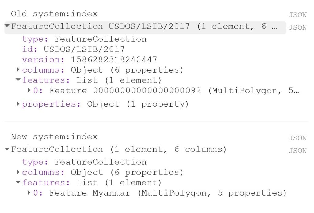 The first thing to do is to load the shapefile of Myanmar, using the LSIB dataset. We need to deal with the auto generated system:index, which otherwise causes some visualisation issues later on. The auto generated ID for the Feature could be something like 000000000000000092.