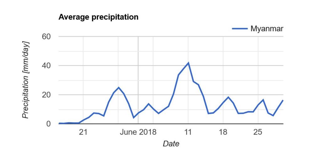 Now what we really want is a graph showing the development of the data through time. Due to the limited memory capacity of Google Earth Engine, I can’t get more than 1.5 month of data, but that is enough to have a look at the onset of the monsoon season in May/June.