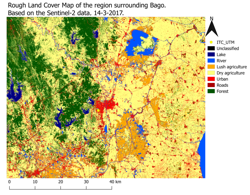 Supervised land classification based on Sentinel 2 data. Created using QGIS.