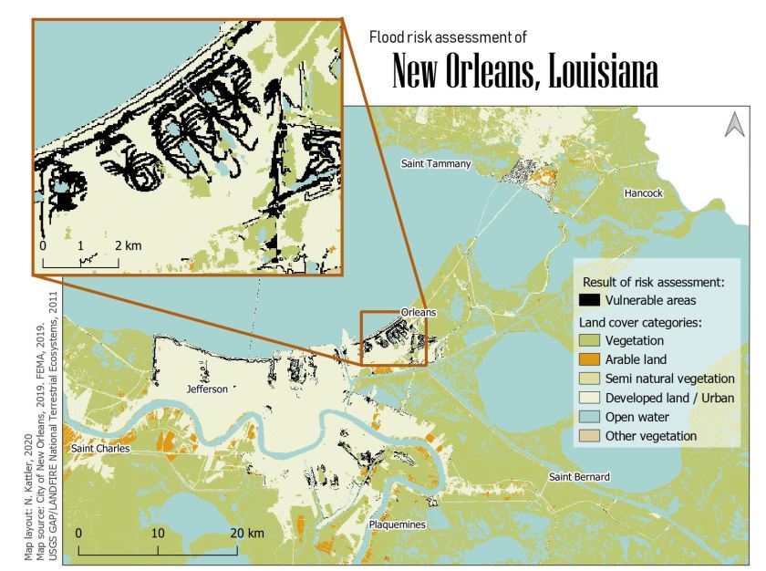 Areas vulnerable to floods in New Orleans, Louisiana. Created using QGIS.
