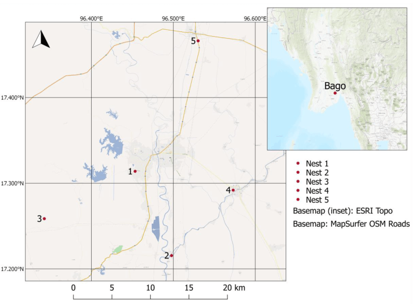 Sensor locations in Bago region, Myanmar, with an inset map. Created using QGIS.