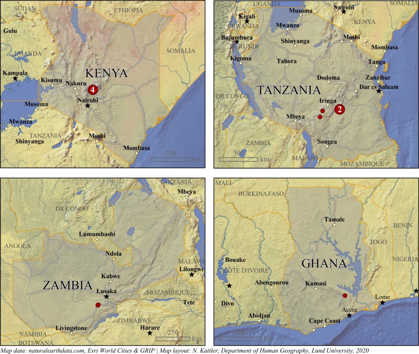 Locations of villages in a study. Created using ArcGIS Pro.