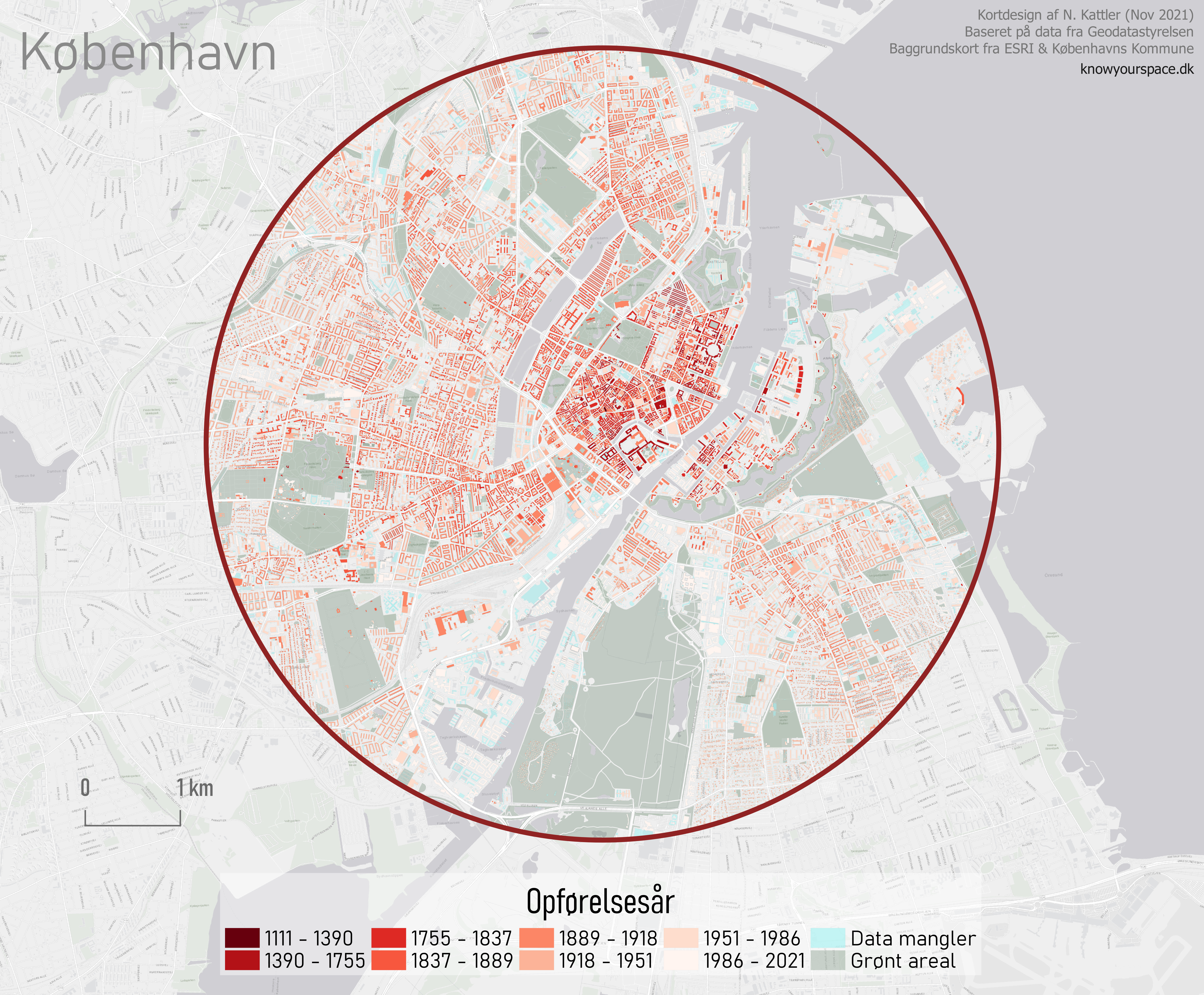 English and Danish version of a map showing the year of construction of buildings in the Danish capital, Copenhagen. Created using QGIS 3.10. Read about how I made the map here.